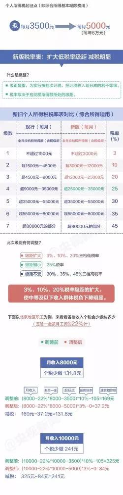 “起征點”上調,稅率結構優(yōu)化調整,一系列改革動作后,你每月會少繳納多少錢?一張圖看懂↓