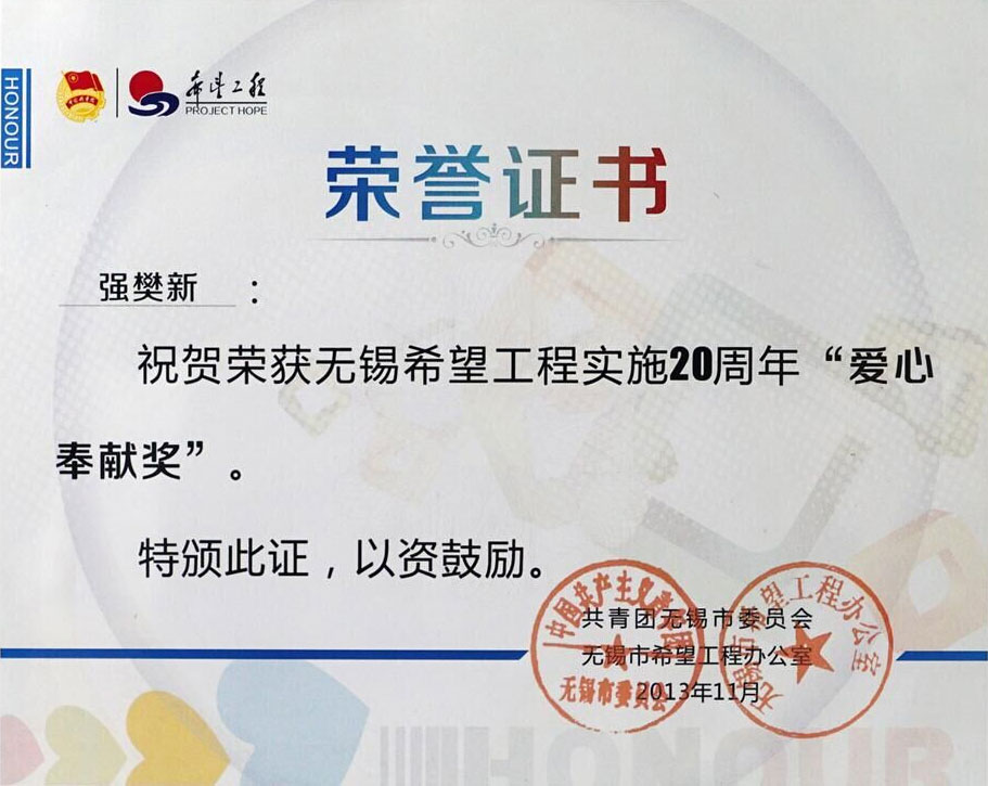2013.11 無(wú)錫希望工程實(shí)施20周年愛(ài)心奉獻(xiàn)獎(jiǎng)